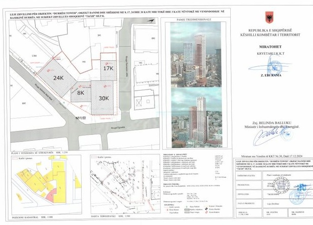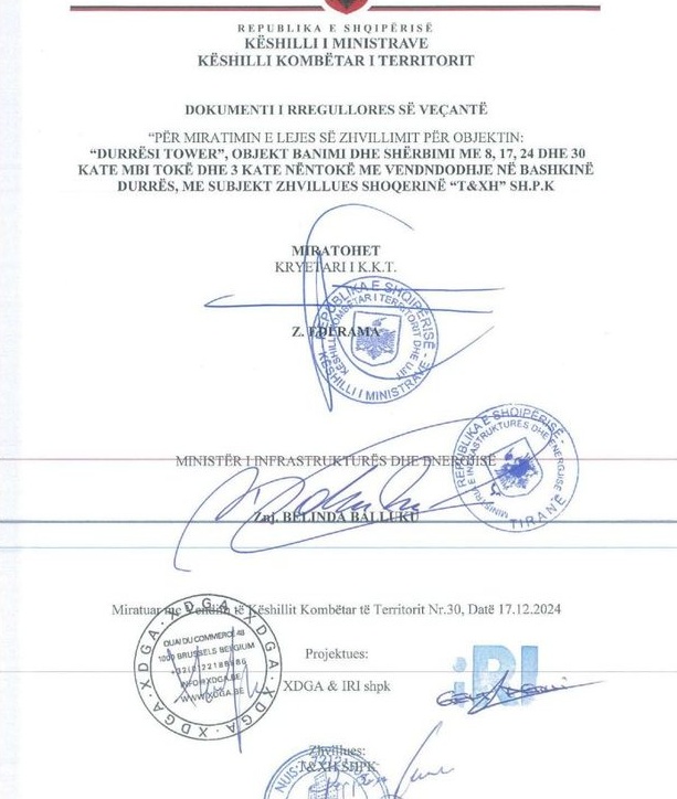 Sipas dokumenteve të Agjencisë së Zhvillimit të Territorit, është miratuar leja e zhvillimit për objektin “Durrësi Tower”, një kompleks banimi dhe shërbimi me 8, 17, 24 dhe 30 kate mbi tokë, si dhe 3 kate nëntokë, i vendosur në Bashkinë Durrës. Subjekt zhvillues i projektit është shoqëria “T & XH” sh.p.k.