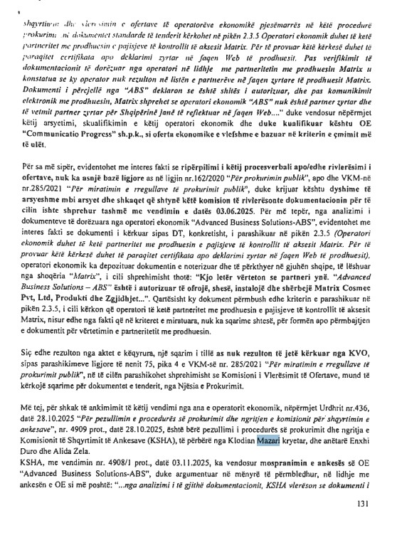Personazhi i dytë i lidhur me vjedhjen e TIMS-it që shfaqet në dosjen e AKSHI-t është Klodian Mazari, një nga civilët që më 2 gusht 2023 hynë në ambientet e Policisë së Shtetit për të kopjuar të dhëna sensitive. Mazari rezulton lidhje e biznesmenit Ermal Beqiri, i shpallur në kërkim nga SPAK, dhe sipas dosjes (faqe 131) ai mbante postin e Kryetarit të Komisionit të Shqyrtimit të Ankesave (KSHA) pranë AKSHI-t. Hetimi tregon se Mazari dhe dy anëtarë të tjerë të komisionit kanë rrëzuar në mënyrë të paligjshme ankesën e kompanisë “Advanced Business Solution” të biznesmenit Gerond Meçe, duke përdorur një arsyetim pa bazë ligjore. SPAK vlerëson se përfshirja e këtyre dy personazheve forcon dyshimet se grabitja e databazës TIMS dhe aferat me tenderat e AKSHI-t janë pjesë e veprimtarisë së një grupi të strukturuar kriminal, me shtrirje dhe rrezikshmëri të lartë për sigurinë e informacionit shtetëror.
