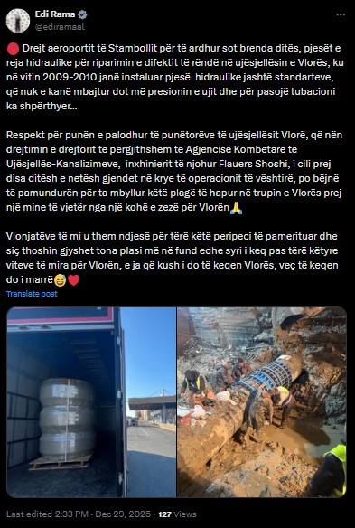 Drejt aeroportit të Stambollit për të ardhur sot brenda ditës, pjesët e reja hidraulike për riparimin e difektit të rëndë në ujësjellësin e Vlorës, ku në vitin 2009-2010 janë instaluar pjesë hidraulike jashtë standarteve, që nuk e kanë mbajtur dot më presionin e ujit dhe për pasojë tubacioni ka shpërthyer… Respekt për punën e palodhur të punëtorëve të ujësjellësit Vlorë, që nën drejtimin e drejtorit të përgjithshëm të Agjencisë Kombëtare të Ujësjellës-Kanalizimeve, inxhinierit të njohur Flauers Shoshi, i cili prej disa ditësh e netësh gjendet në krye të operacionit të vështirë, po bëjnë të pamundurën për ta mbyllur këtë plagë të hapur në trupin e Vlorës prej një mine të vjetër nga një kohë e zezë për Vlorën. Vlonjatëve të mi u them ndjesë për tërë këtë peripeci të pamerituar dhe siç thoshin gjyshet tona plasi më në fund edhe syri i keq pas tërë këtyre viteve të mira për Vlorën, e ja që kush i do të keqen Vlorës, veç të keqen do i marrë