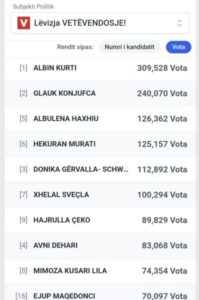 Në Lëvizjen Vetëvendosje prin Albin Kurti me 309,828 vota.