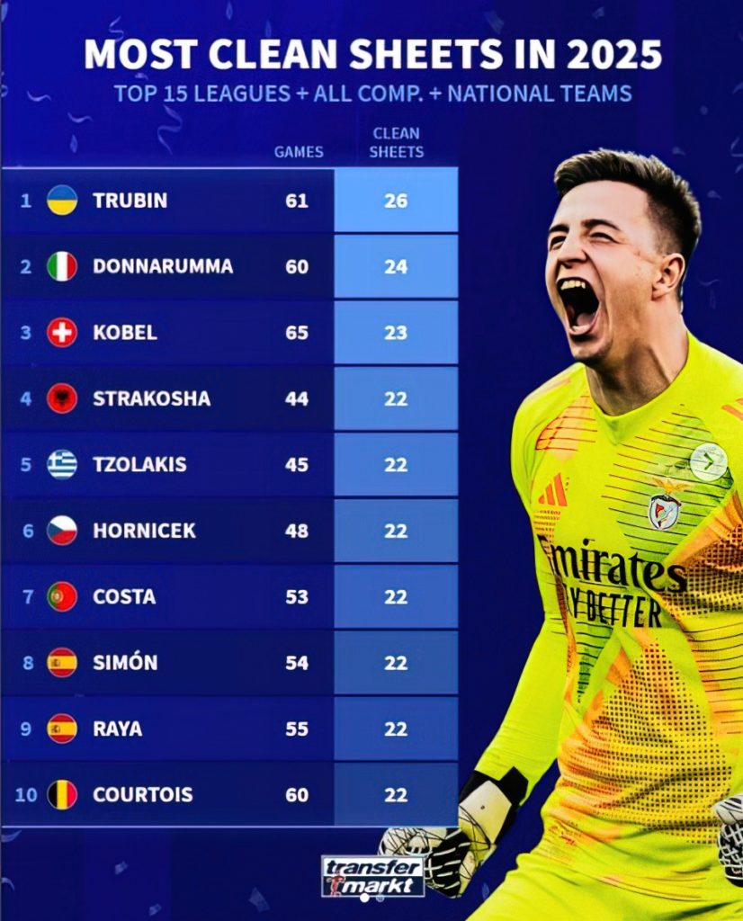 Portierë si Kostas, Simon dhe Raja qëndrojnë poshtë tij, ndërsa vetëm yje si Trubin, Donnarumma dhe Kobel kanë arritur të kenë performancë më të mirë. Një fakt që dëshmon qartë se Strakosha është jo vetëm lideri i Kombëtares shqiptare, por edhe një nga gardianët më të respektuar të momentit në futbollin evropian.