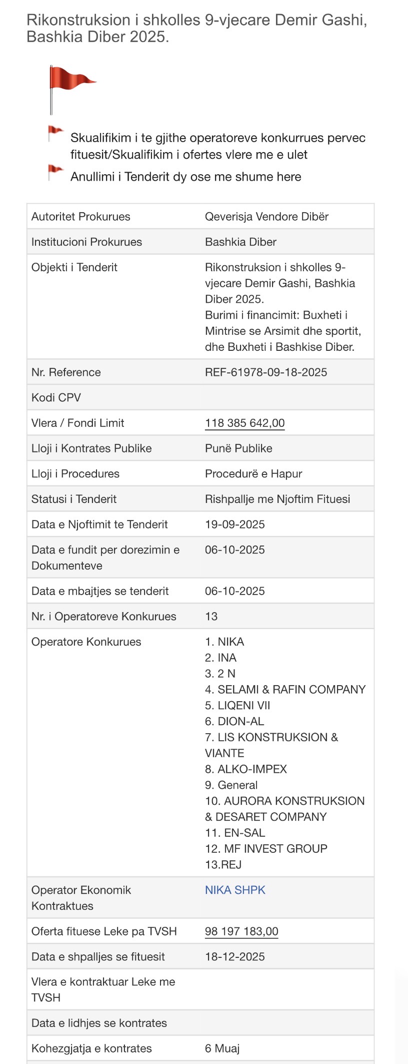 Një tender me vlerë mbi 1 milion euro (118,385,642 lekë) për rikonstruksionin e shkollës 9-vjeçare "Demir Gashi" në Bashkinë Dibër ka ngritur dyshime për hulumtime nga redaksia e JOQ përsa i përket transparencës së institucioneve shtetërore dhe konkurrencën e korruptuar kur bëhet fjalë për para publike.