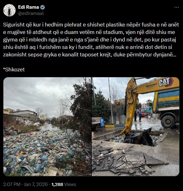 Kryeministri Edi Rama ka reaguar sërish në rrjetin X për përmbytjet në Durrës, duke publikuar pamje nga zona e Shkozetit ku kanalet kulluese janë bllokuar nga mbeturinat. Si zakonisht, Rama ka zgjedhur të fajësojë qytetarët për situatën, duke shmangur çdo përgjegjësi direkte të qeverisë dhe pushtetit vendor që ai vetë kontrollon prej vitesh.