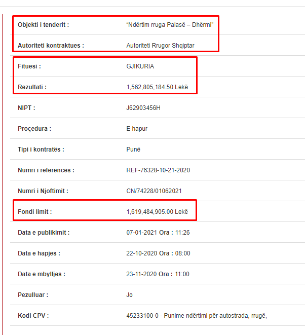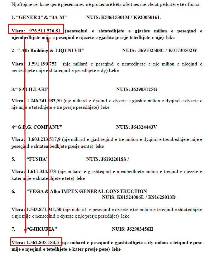 Tenderi me numër reference REF-76328-10-21-2020 u zhvillua mes 7 kompanive apo bashkimeve operatorësh, por fituesi doli pothuajse identik me fondin limit: 1,562,805,184 lekë të reja pa TVSH, ose rreth 96.5% e fondit të parashikuar. Një “përputhje” kaq perfekte sa të lë të kuptosh se gara ka qenë më shumë formale sesa reale. Kur fituesi afrohet në mënyrë milimetrike me tavanin maksimal, ndërsa ofertat më të lira hidhen në kosh, dyshimet për një fitues të paracaktuar nuk janë thjesht hamendësime, por një model i njohur i administrimit të parasë publike.