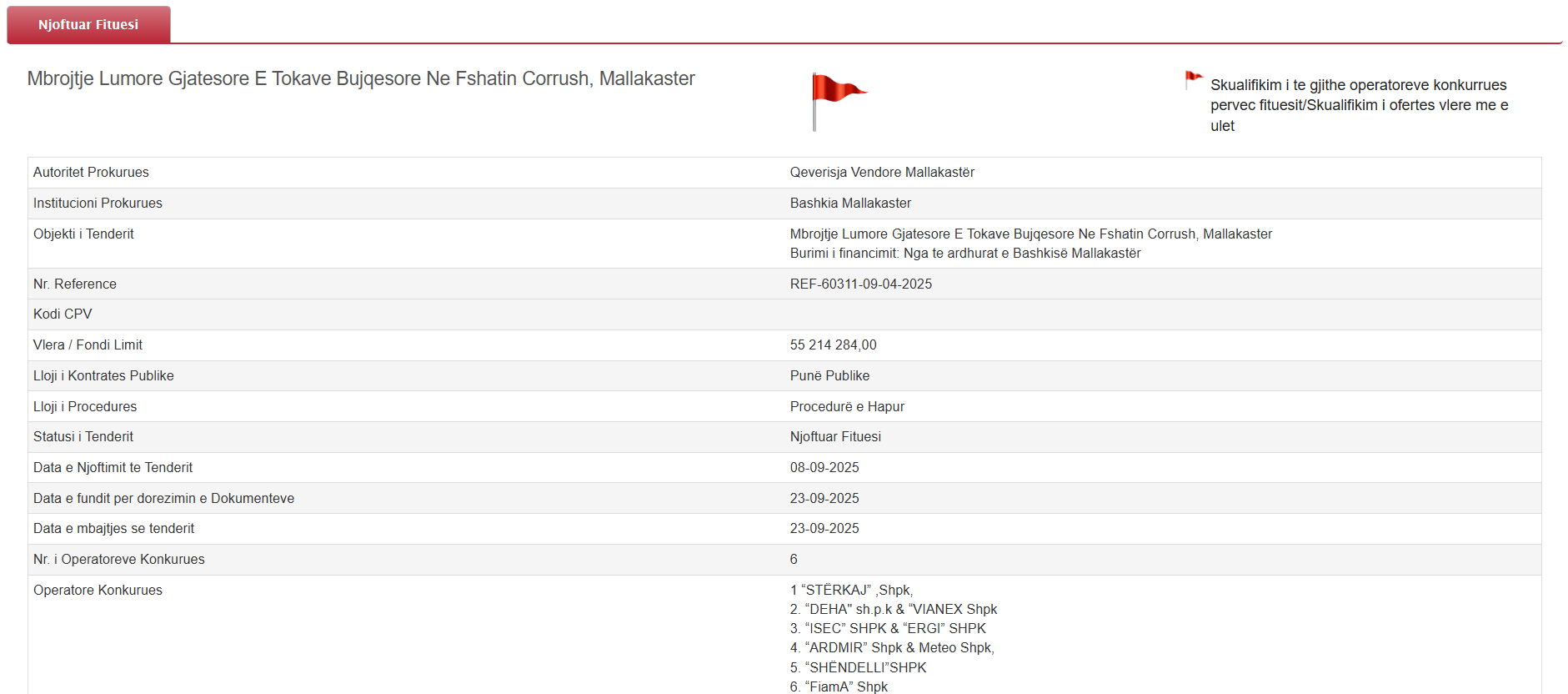 Një tender i zhvilluar nga Bashkia Mallakastër për objektin “Mbrojtje Lumore Gjatësore e Tokave Bujqësore në fshatin Corrush” po ngre një sërë pikëpyetjesh mbi mënyrën e zhvillimit të procedurës dhe nivelin real të konkurrencës, bazuar në dokumentacionin zyrtar të prokurimit dhe vendimet e institucioneve përkatëse.