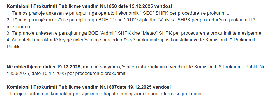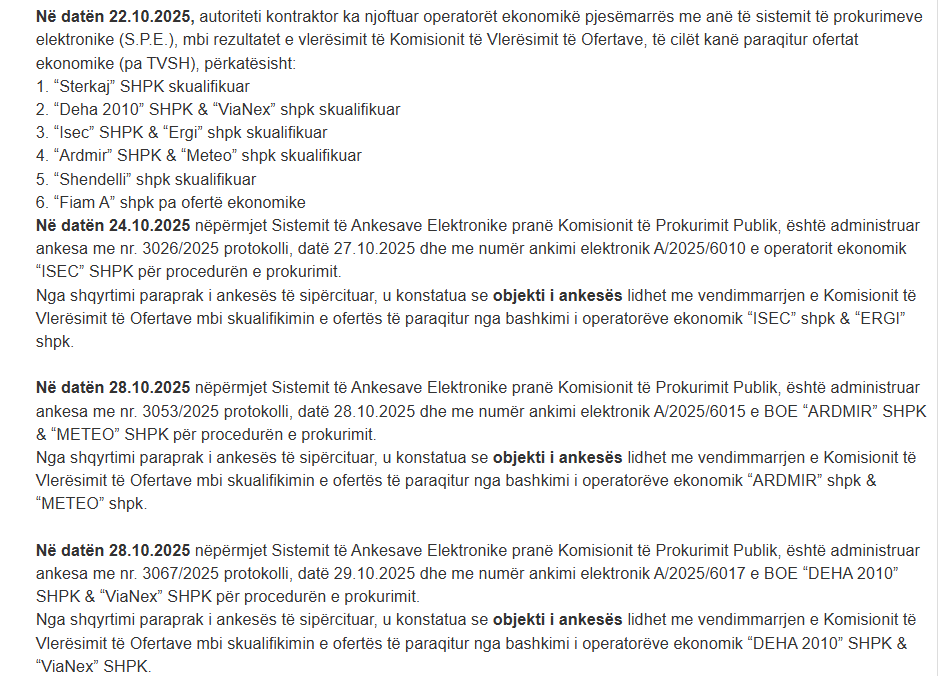Pas këtyre skualifikimeve, tre operatorë paraqitën ankesa në Komisionin e Prokurimit Publik (KPP). Dy prej tyre u rrëzuan, ndërsa ankesa e bashkimit të operatorëve “Ardmir” SHPK & “Meteo” SHPK u pranua nga KPP, i cili urdhëroi autoritetin kontraktor të kryente rivlerësimin e procedurës.