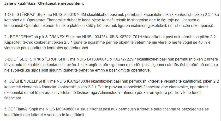 Sipas dokumenteve, Komisioni i Vlerësimit të Ofertave skualifikoi çdo subjekt për arsye të ndryshme teknike dhe administrative: mungesë stafi specifik në licencë, mosplotësim kriteresh për punë të ngjashme, gabime formale në sigurimin e ofertës apo mungesë dokumentacioni financiar. Një nga operatorët nuk paraqiti fare ofertë ekonomike.