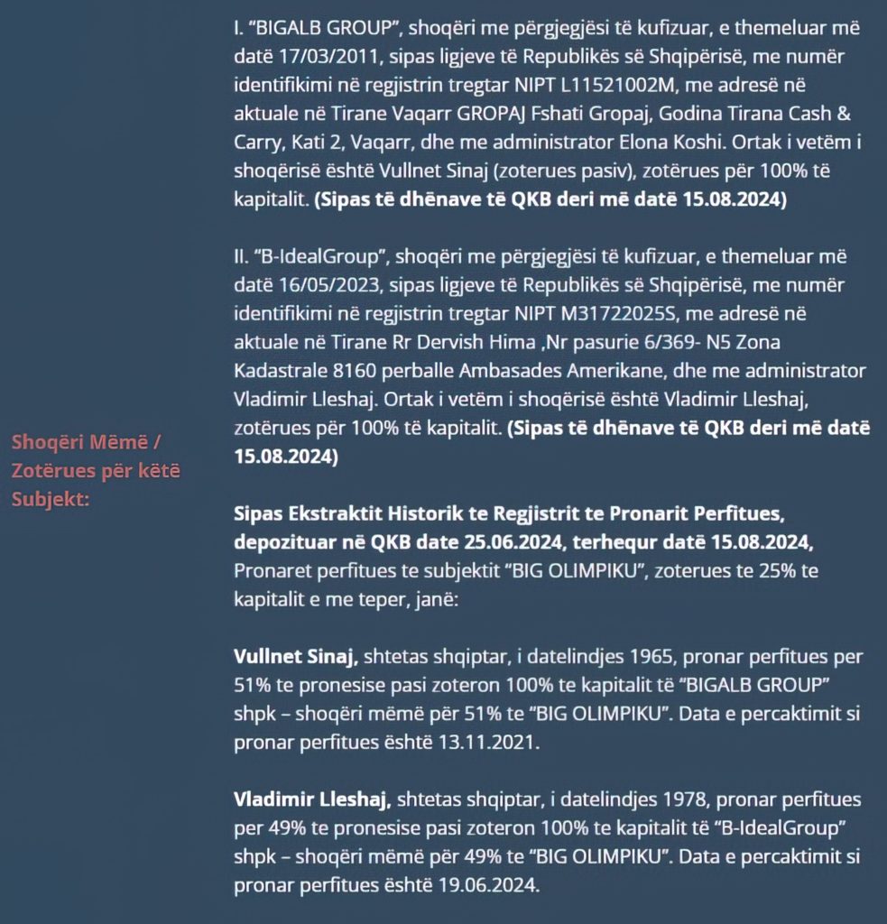 Ky filial zotërohet 50% nga deputeti Vullnet Sinaj dhe 50% nga ortaku Vladimir Lleshaj. Për më tepër, denoncimet e mëparshme të JOQ Albania kishin zbuluar një model të ngjashëm mashtrimi, por me aksionere të ndryshme, si Monika Çela.