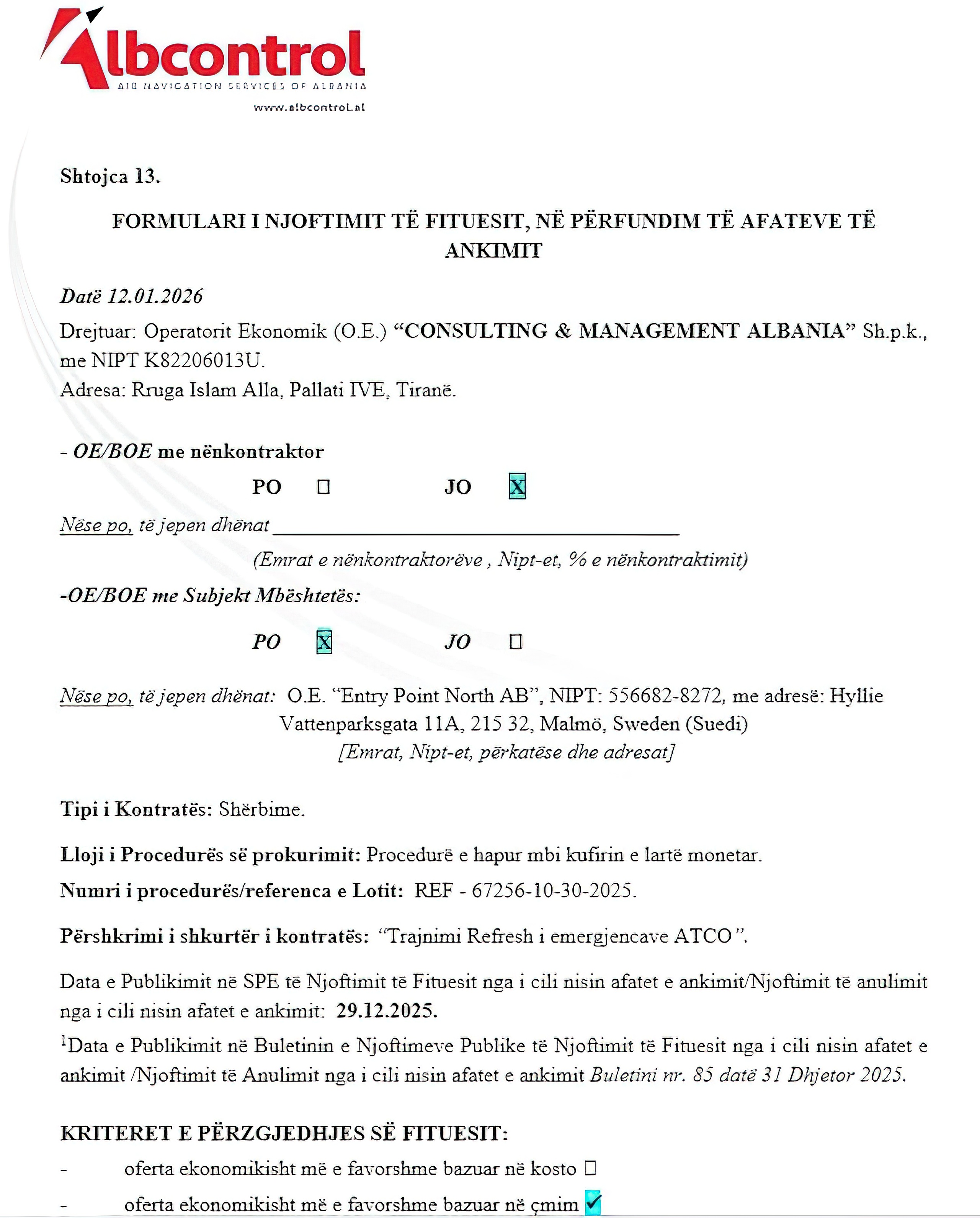Sipas dokumenteve zyrtare në Agjencinë e Prokurimit Publik, kompania e zotëruar nga Ervis Myftari është shpallur fituese për trajnimin e stafit të Albcontrol në raste emergjencash. Me një ofertë prej rreth 700 mijë eurosh (69.5 milionë lekë), ajo mposhti operatorin tjetër në garë, duke konfirmuar lidhjen e saj të fortë me këtë institucion, nga i cili ka marrë vazhdimisht tendera.