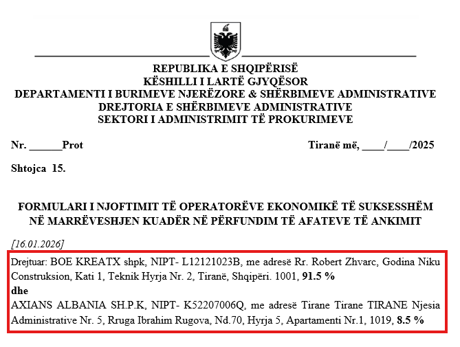 Fondi limit i tenderit është përcaktuar në 119,166,608 lekë të reja pa TVSH, ndërsa fituese është shpallur bashkimi i operatorëve KREATX sh.p.k dhe AXIANS ALBANIA sh.p.k, me një ofertë prej 110,883,824 lekë pa TVSH, ose rreth 1.3 miliardë lekë të vjetra me TVSH. Kjo vlerë përbën rreth 93% të fondit limit, një diferencë minimale që në praktikat e prokurimeve publike shpesh konsiderohet tregues i mungesës së konkurrencës reale.