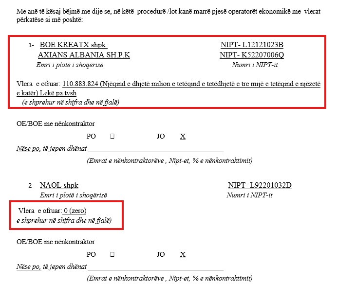 Sipas hulumtimit të dokumenteve nga JOQ Albania, në këtë tender kanë marrë pjesë vetëm dy kompani, por njëra prej tyre nuk ka ofruar asnjë vlerë financiare. Në këto kushte, fituese është shpallur e vetmja ofertë e paraqitur, pra bashkimi i dy operatorëve të mësipërm, duke e kthyer procedurën faktikisht në një garë pa garë.