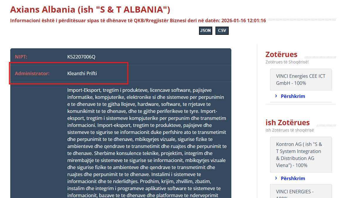 Nga ana tjetër, Kleanthi Prifti, administrator i Axians Albania sh.p.k, përmendet gjithashtu në media si personazh problematik. Kompania Axians Albania, sipas denoncimeve, ka ndryshuar herë pas here emrin dhe është lidhur me struktura në Francë dhe Gjermani. Po sipas mediave, Prifti nuk ka zbatuar ligjin për deklarimin e pronarëve përfitues, duke mos deklaruar në QKB pronarin fundor të kompanisë. Madje, thuhet se në shkelje të ligjit dhe me dokumentacion të dyshimtë, ai ka përfituar rreth 3.5 milionë euro nga tendera publikë, përfshirë edhe procedura të mbyllura apo sekrete nga Agjencia Kombëtare e Shoqërisë së Informacionit.