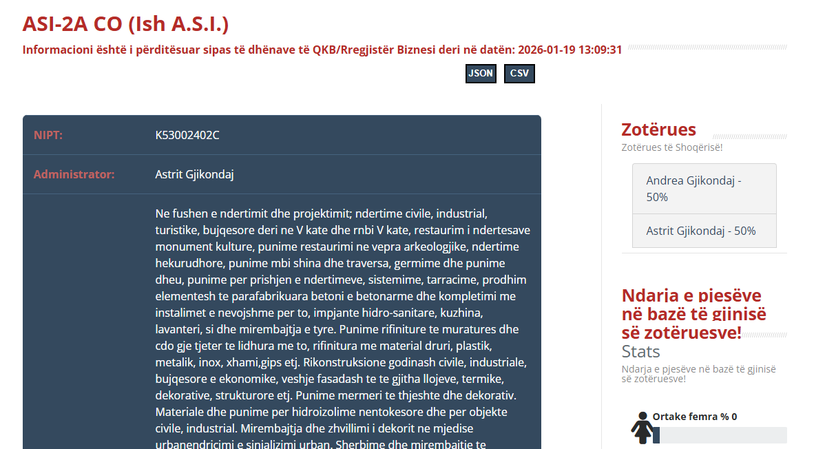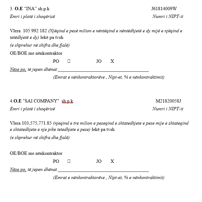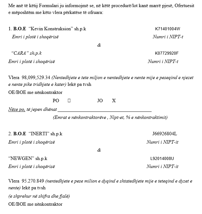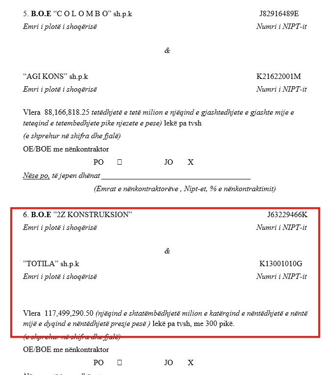 Bashkimi i operatorëve ekonomikë i përbërë nga firmat “2Z KONSTRUKSION” në pronësi të Zani Zogës, “TOTILA” në pronësi të Jemin Totos dhe “ASI-2A CO” në pronësi të Andrea dhe Astrit Gjikondajt, arriti të rrëmbejë kontratën me vlerën 117,499,290 lekë të reja pa TVSH.