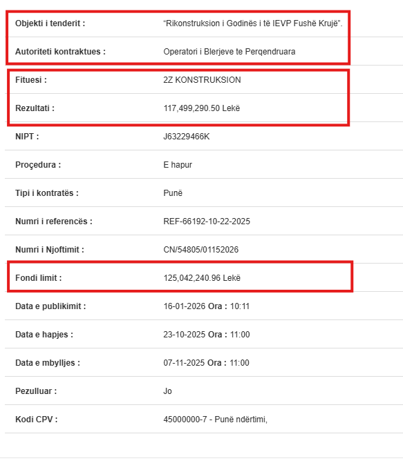 Një tjetër procedurë prokurimi publik po ngre dyshime të forta për abuzim me fondet e shtetit dhe paracaktim të fituesit. Operatori i Blerjeve të Përqendruara ka mbyllur së fundmi tenderin me numër reference REF-66192-10-22-2025, i cili ka si objekt rikonstruksionin e godinës së Institucionit të Ekzekutimit të Vendimeve Penale (IEVP) në Fushë Krujë.