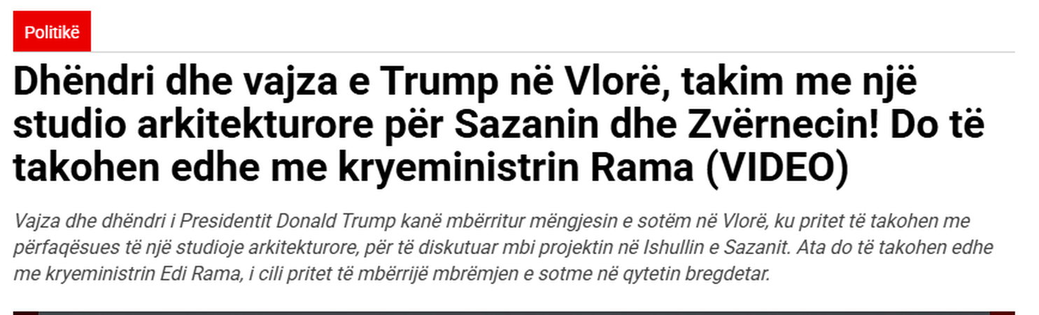 Disa portale dhe televizione në Shqipëri dhe Kosovë raportuan së fundmi se Jared Kushner, dhëndri i presidentit amerikan Donald Trump, ishte parë në Vlorë, duke krijuar përshtypjen e një vizite diskrete me rëndësi gjeopolitike.