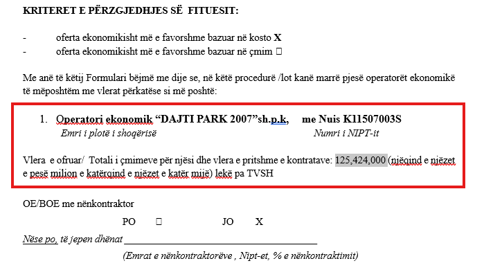 Sipas dokumenteve zyrtare, rezultati i këtij tenderi kap shifrën marramendëse prej 125,424,000 lekë të reja pa TVSH ose afërsisht 1.5 milionë euro me TVSH.
