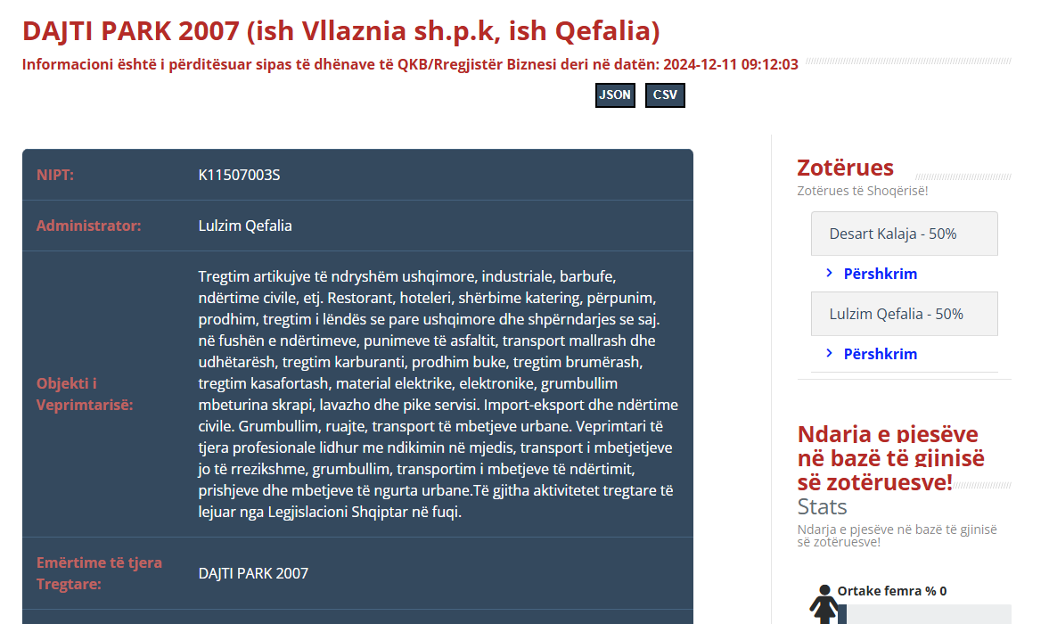 Ajo që e bën këtë tender të dyshimtë nuk është vetëm vlera e lartë, por pronësia e kompanisë fituese. “DAJTI PARK 2007” është në pronësi të shtetasve Lulzim Qefalia dhe Desart Kalaja. Lulzim Qefalia është as më pak e as më shumë se vëllai i Xhemal Qefalisë, figurës së njohur politike dhe aktualisht Zëvendësministër i Brendshëm.