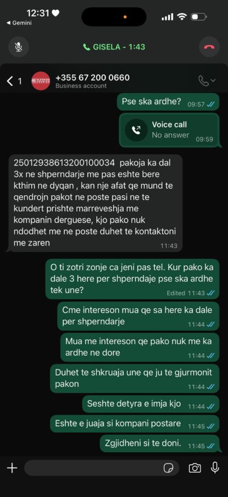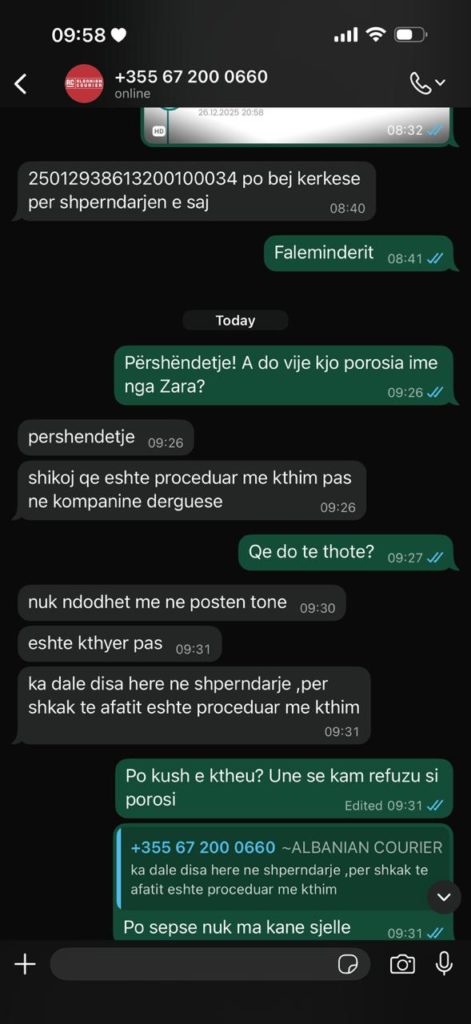 Qytetari thekson se nuk është kontaktuar në mënyrë të rregullt nga korrierët dhe se nuk i është dhënë një shpjegim i qartë mbi arsyet e mosdorëzimit të porosisë. Në bisedat me përfaqësues të shërbimit ndaj klientit, ai pretendon se ka marrë përgjigje kontradiktore, ndërkohë që problemi ka mbetur i pazgjidhur dhe porosia nuk i është dorëzuar as pas disa tentativave të deklaruara nga kompania.