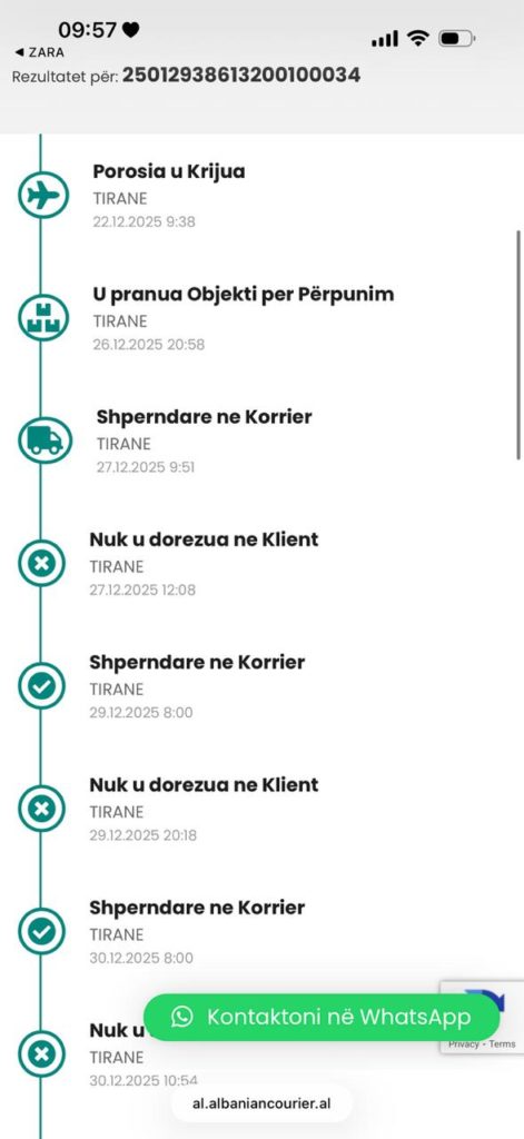 Një qytetar ka denoncuar pranë JOQ Albania problematikat e hasura me kompaninë postare Albanian Courier, duke pretenduar se porosia e tij nuk është dorëzuar pavarësisht se disa herë ka rezultuar me statusin “në shpërndarje”. Sipas komunikimeve dhe pamjeve të vëna në dispozicion, dërgesa është nxjerrë disa herë për shpërndarje, por pa mbërritur kurrë te klienti, ndërsa më pas është shënuar si “nuk u dorëzua te klienti / e kthyer”.
