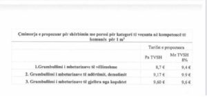 Sipas dokumentit zyrtar të çmimores, tarifa për amvisëritë rezidente është përcaktuar në 5.56 euro në muaj pa TVSH, respektivisht 6.20 euro në muaj me TVSH 8%, ndërsa për amvisëritë jorezidente tarifa vjetore arrin në 17.8 euro me TVSH.