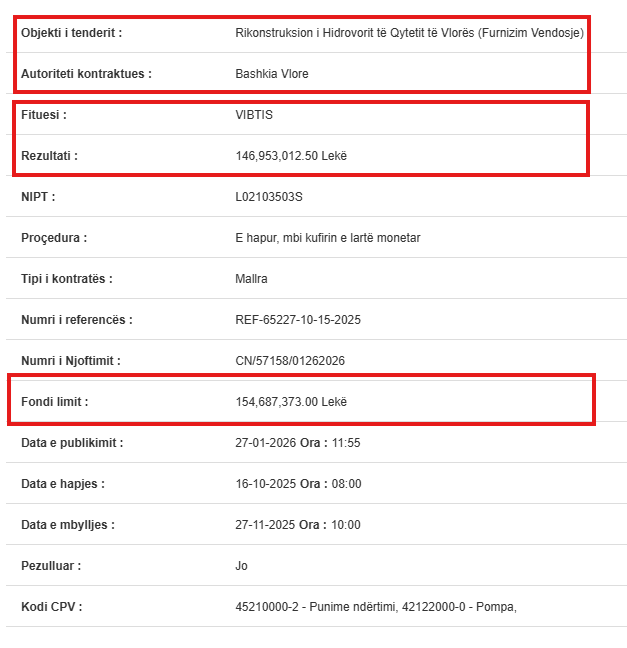Bashkia e Vlorës, nën drejtimin e Bruna Mersinit, ka finalizuar një procedurë prokurimi që ngre dyshime të forta për paracaktim dhe goditje të konkurrencës së lirë. Objekti i këtij tenderi, i cili mban numrin e referencës REF-65227-10-15-2025, është rikonstruksioni dhe furnizimi me pajisje për Hidrovorin e Qytetit të Vlorës, një projekt ky me rëndësi jetike për menaxhimin e ujërave në qytet. Megjithëse gara ishte e hapur dhe mbi kufirin e lartë monetar, rezultati përfundimtar tregon një skemë të mirëfilltë ku paratë publike janë kanalizuar drejt një fituesi të paracaktuar.