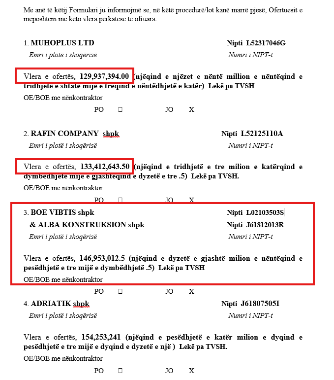Për më tepër, të dhënat e bëra publike tregojnë se në këtë tender kanë marrë pjesë katër kompani, ku dy prej tyre kanë paraqitur oferta ekonomike dukshëm më të ulëta sesa bashkimi i operatorëve fitues. Megjithatë, Bruna Mersini ka vendosur t’i skualifikojë këto oferta më të lira, duke lënë në lojë vetëm ofertën që përkonte pothuajse fiks me tavanin buxhetor. Ky veprim dëshmon se kriteri kryesor i këtij tenderi nuk ka qenë kursimi i taksave të qytetarëve, por favorizimi i kompanive me lidhje të forta nepotike dhe klienteliste, duke e kthyer rikonstruksionin e hidrovorit në një tjetër aferë të dyshimtë në qytetin bregdetar.