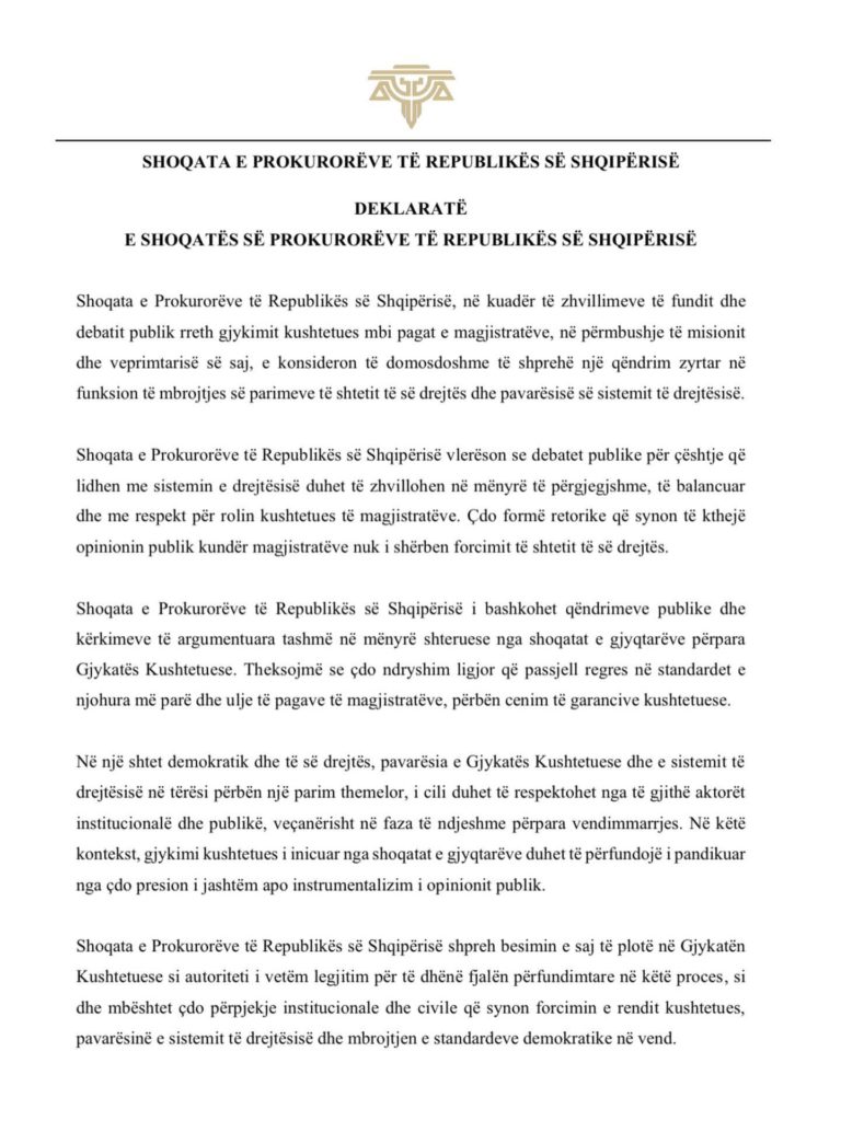 Shoqata e Prokurorëve shpreh besimin e saj të plotë në Gjykatën Kushtetuese si autoritetin e vetëm legjitim për vendimin përfundimtar mbi këtë çështje dhe mbështet çdo përpjekje që synon forcimin e rendit kushtetues, pavarësinë e sistemit të drejtësisë dhe ruajtjen e standardeve demokratike në vend.