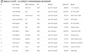 Sipas dokumenteve zyrtare të Agjencisë Kosovare të Privatizimit, në periudhën 2004–2006 janë privatizuar 22 hotele në Kosovë, për një vlerë totale prej mbi 25 milionë euro, ku blerësit kanë qenë kompani dhe individë kryesisht nga Kosova.