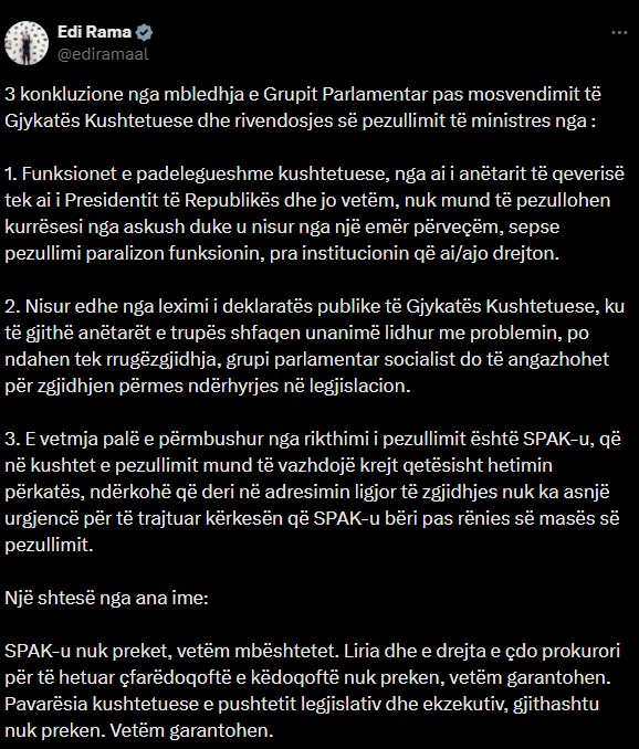 Pas mbledhjes, Rama publikoi në rrjetin social X tre “konkluzione” që, sipas tij, përfaqësojnë qëndrimin e PS. Në thelb, ai kundërshton idenë se funksionet kushtetuese të padelegueshme nga ministrat deri te Presidenti mund të pezullohen, duke argumentuar se një veprim i tillë paralizon institucionin dhe jo vetëm individin. Ky qëndrim shihet nga kritikët si një përpjekje e hapur për të mbrojtur Ballukun dhe për të relativizuar efektet e masave ligjore.