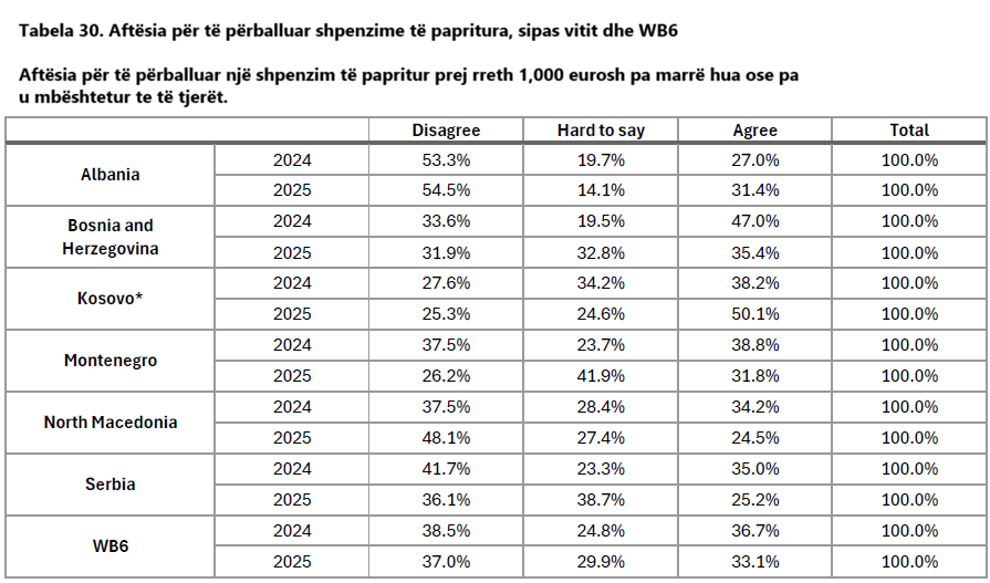 Edhe Maqedonia e Veriut mbetet në nivele të larta vulnerabiliteti, ku 48.1% deklarojnë pamundësi për të mbuluar një kosto emergjente. Në kontrast, Kosova shënon përmirësim të ndjeshëm, me 50.1% që shprehen se mund ta përballojnë këtë shumë, nga 38.2% në vitin 2024. Ndërkohë, në Serbi vetëm 25.2% ndihen të aftë financiarisht për një shpenzim prej 1,000 eurosh, në rënie nga 35%, ndërsa 38.7% janë përgjigjur “vështirë të thuhet”, niveli më i lartë i pasigurisë në rajon. Të dhënat bëhen edhe më domethënëse kur krahasohen me pagat mesatare mujore neto për vitin 2025.