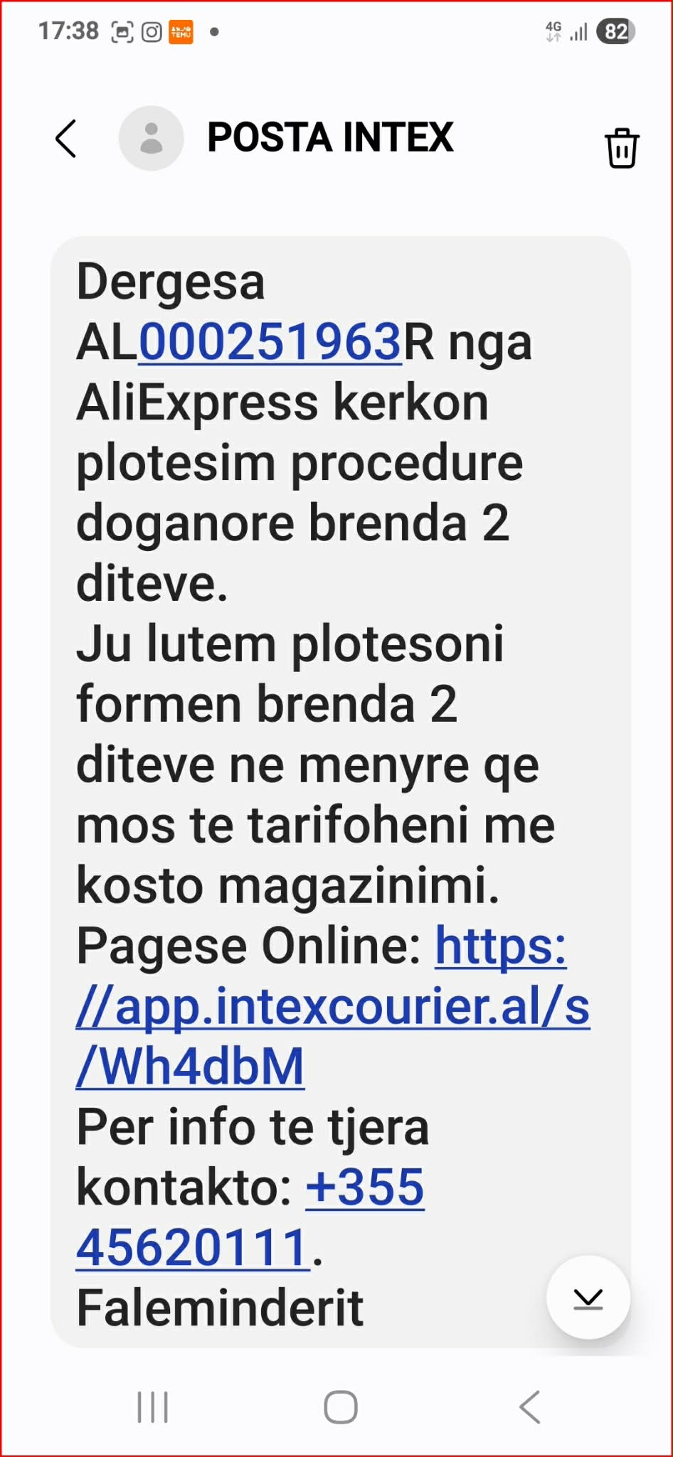 "Prsh. S'dijme ku te ankohemi pervec te faqja Juaj ne kete vend. – Kam blere ne Aliexpress nje produkt me vlere €10., dhe posta me emrin "Intexcourier" e ka bllokuar kete produkt dhe me kerkon qe te paguaj ~12.000 leke te vjetra dogane. Kjo poste pret qe ty te te vije edhe nje produkt tjeter qe mund te jete blere 4 dite me pas., e bashkangjit qe te kaloje tarifen prej €22 qe mbi kete shume ne Shqiperi paguhet dogane. Nderkohe kjo poste me dergon vetem njeri "track order"., dhe tjetrin e fsheh qellimisht. Ky eshte Track order qe me dergon: AL000251963R