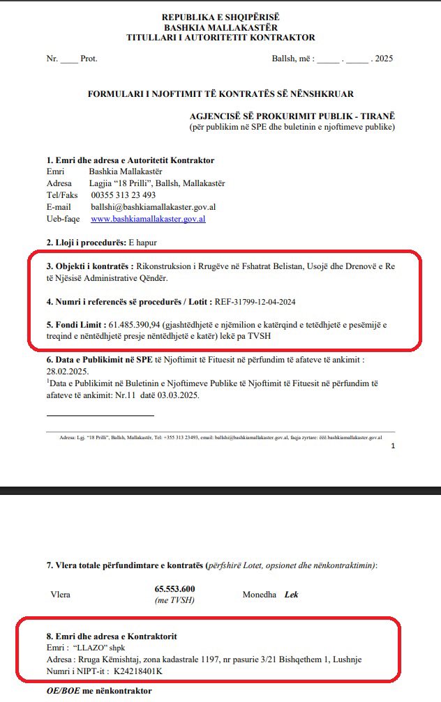 Rruga prej 1.5 kilometrash u rikonstruktua nga kompania Llazo Shpk, në kuadër të një kontrate me vlerë 65,553,600 lekë (rreth 655 mijë euro me TVSH), të shpallur nga Bashkia Mallakastër. Kompania, me seli në Bishqethëm të Lushnjes dhe në pronësi të Aldi dhe Anea Llazo, ishte skualifikuar në vitin 2024 për gjashtë muaj nga përfitimi i kontratave publike, pasi kishte mashtruar në të paktën katër tendera duke mos deklaruar një gjobë të vendosur nga Inspektoriati Shtetëror i Punës dhe Shërbimeve Shoqërore.