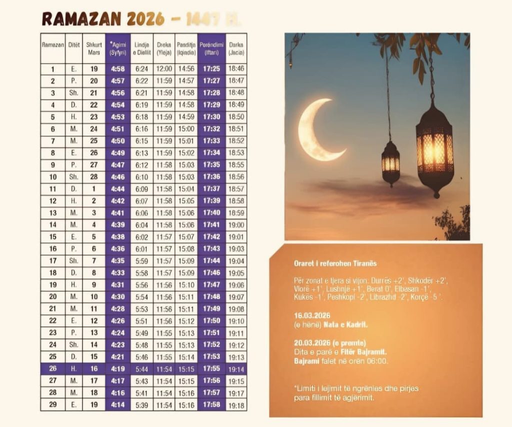 Ka nisur sot, 19 shkurt, muaji i begatë i Ramazanit, duke sjellë një atmosferë të veçantë përkushtimi dhe qetësie shpirtërore. Besimtarët myslimanë janë ngritur herët në orët e para të mëngjesit për të konsumuar syfyrin e parë, duke bërë nijetin për agjërimin e kësaj dite të shenjtë. Agjërimi do të vijojë për 30 ditë deri në datë 19 mars.