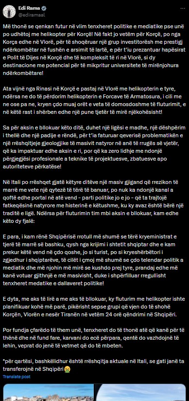 Edi Rama ka reaguar me tone ironike ndaj kritikave për bllokimin e aksit Prrenjas–Librazhd dhe përdorimin e helikopterit për udhëtimin e tij drejt Korçës dhe Vlorës. Në vend që të japë sqarime konkrete për situatën në terren dhe vështirësitë e qytetarëve të prekur nga rrëshqitjet e dherave, kreu i qeverisë përmes rrjetit social X zgjodhi të krahasojë situatën me një rrëshqitje masive në Itali. Sipas tij, fenomenet gjeologjike ndodhin kudo dhe nuk përbëjnë përgjegjësi të qeverisë.