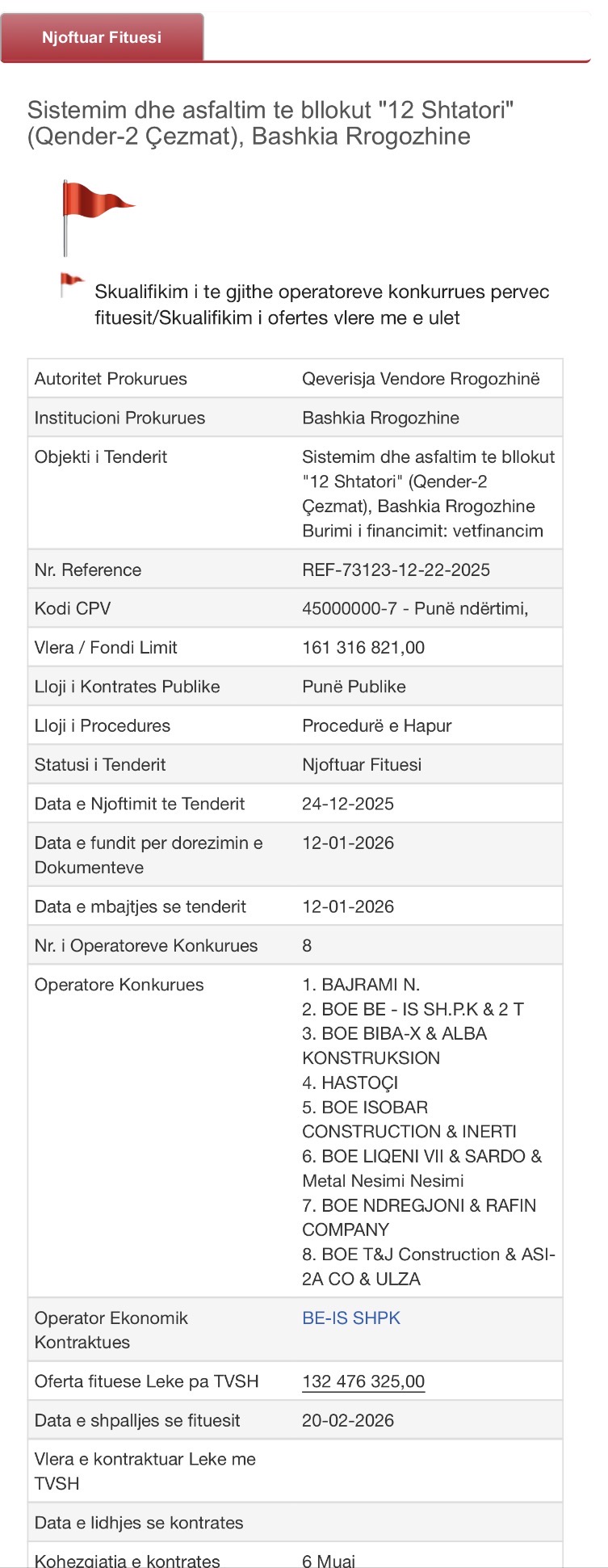 Tenderi është zhvilluar me procedurë të hapur teksa në garë morën pjesë 8 operatorë ekonomikë, por në fund fituese në shkelje të ligjit dje skualifikimin e të gjitha ofertave në garë u shpall kompania BE-IS Shpk, e biznesmenit Hamz Islamaj.