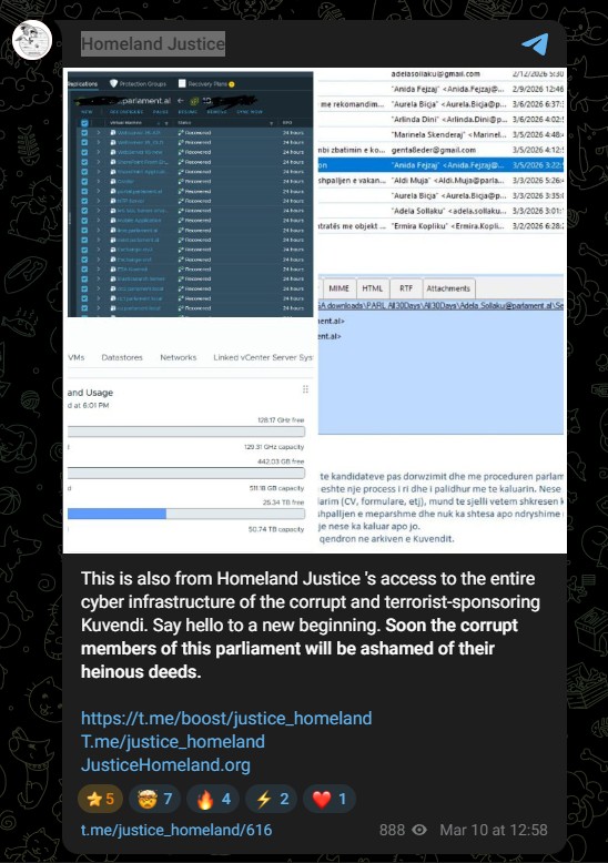“Kjo është gjithashtu nga qasja e Homeland Justice në të gjithë infrastrukturën kibernetike të Kuvendit të korruptuar dhe sponsorizues të terrorizmit. Përshëndetje një fillimi të ri. Së shpejti anëtarët e korruptuar të këtij parlamenti do të turpërohen për veprat e tyre të urryera”, shkruhet në postimin e Homeland Justice në Telegram.