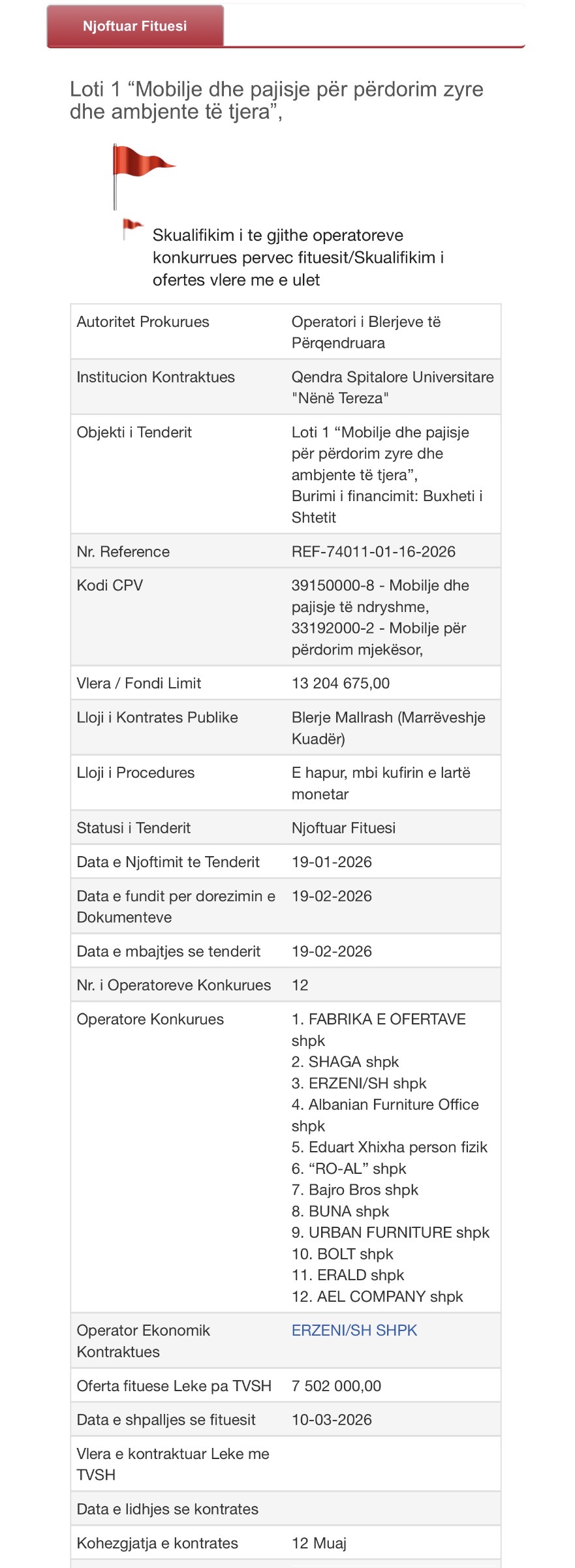 Dokumenti zyrtar konfirmon atë që dyshohej, skualifikimin e të gjithë operatorëve konkurrues përveç fituesit. Nga 12 kompani që morën pjesë në garë (përfshirë emra si SHAGA, BUNA, dhe URBAN FURNITURE), 11 prej tyre janë nxjerrë jashtë loje. Kjo krijon një terren ku "gara" është thjesht një procedurë formale për të vulosur fituesin e paracaktuar.