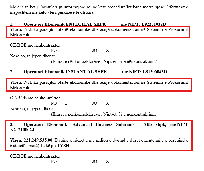 Nga pesë operatorët në garë, dy prej tyre janë futur pa paraqitur asnjë ofertë ekonomike. Pse do të harxhonte kohë një kompani për t'u bërë pjesë e një tenderi mbi kufirin e lartë monetar, vetëm për të mos hedhur asnjë shifër? Përgjigja duket e qartë: për të plotësuar numrin e nevojshëm të pjesëmarrësve dhe për të legjitimuar fitoren e paracaktuar të Meçes, duke krijuar iluzionin e një gare që në fakt nuk ekzistonte.