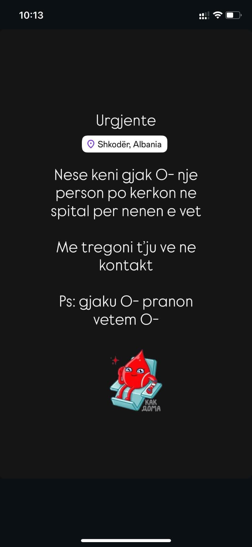 Një qytetar ka bërë apel publik për ndihmë urgjente në sigurimin e gjakut për nënën e tij, e cila ndodhet e shtruar në Spitalin Rajonal të Shkodrës, në repartin e Patologjisë.