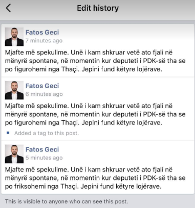 “Mjafte më spekulime. Unë i kam shkruar vetë ato fjali në mënyrë spontane, në momentin kur deputeti i PDK-së tha se po friksohemi nga Thaçi. Jepini fund këtyre lojërave”, postimi i tij e edituar përfundimisht.