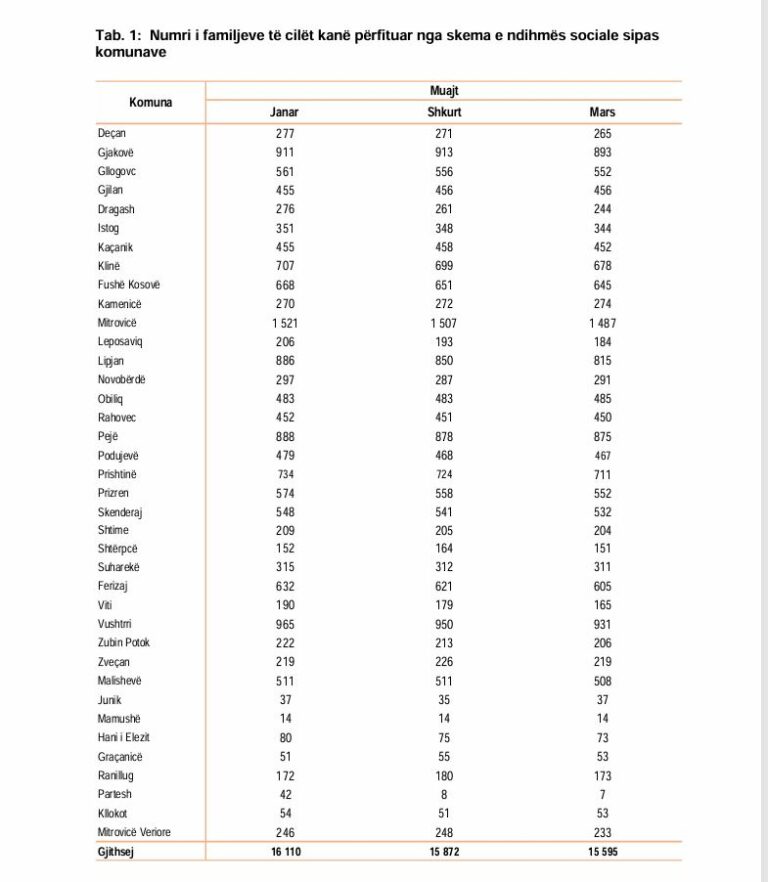 Sipas të dhënave të Agjencisë së Statistikave të Kosovës (ASK), në muajin janar, gjithsej 16,110 familje kanë përfituar nga ndihma sociale. Ky numër ka shënuar një rënie të lehtë në muajt pasues, duke zbritur në 15,872 në shkurt dhe në 15,595 në mars.