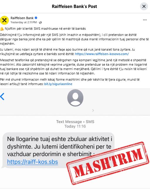 Së fundmi, Raiffeisen Bank ka paralajmëruar klientët për një SMS të tillë mashtrues, i cili synon t’i mashtrojë duke kërkuar ndarjen e informacioneve të ndjeshme.