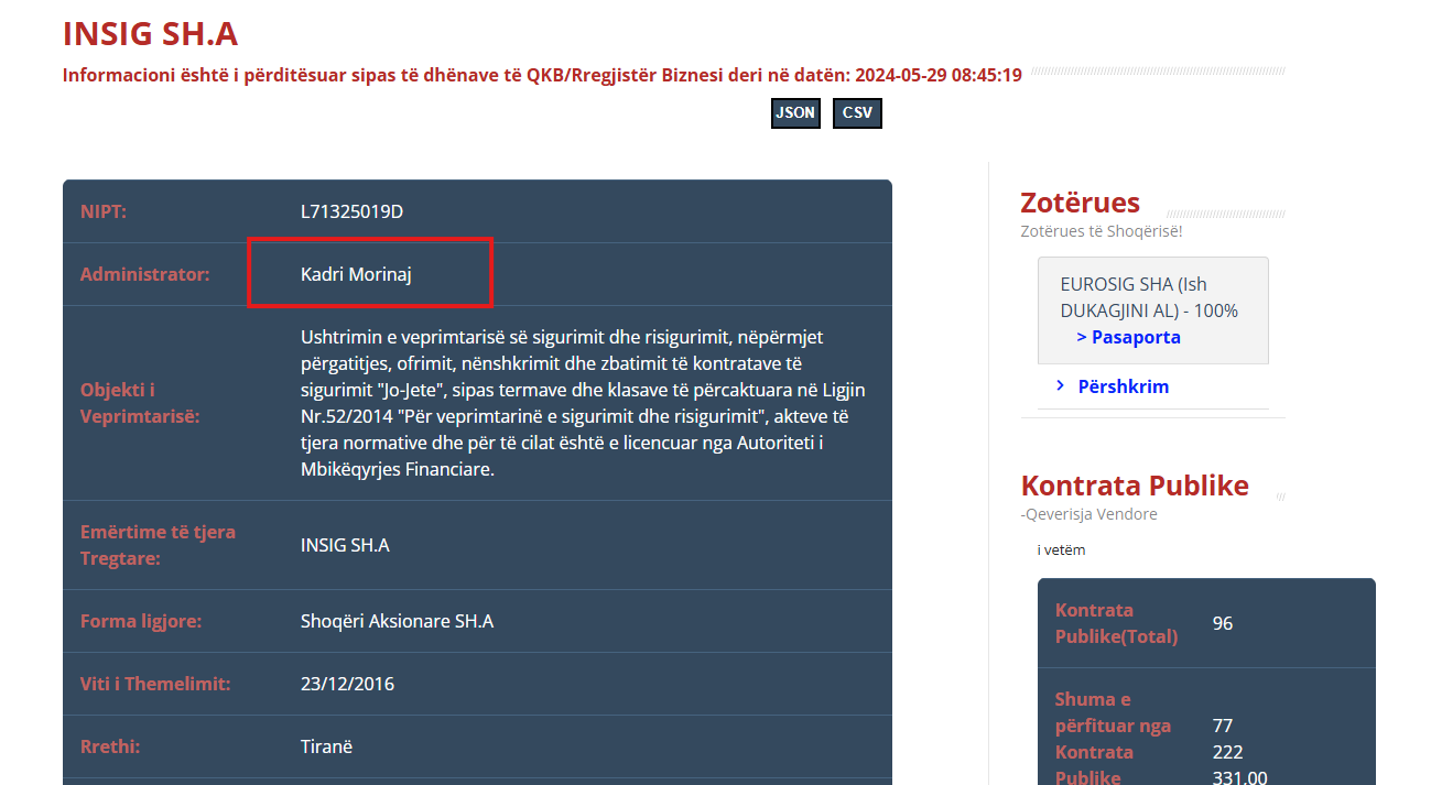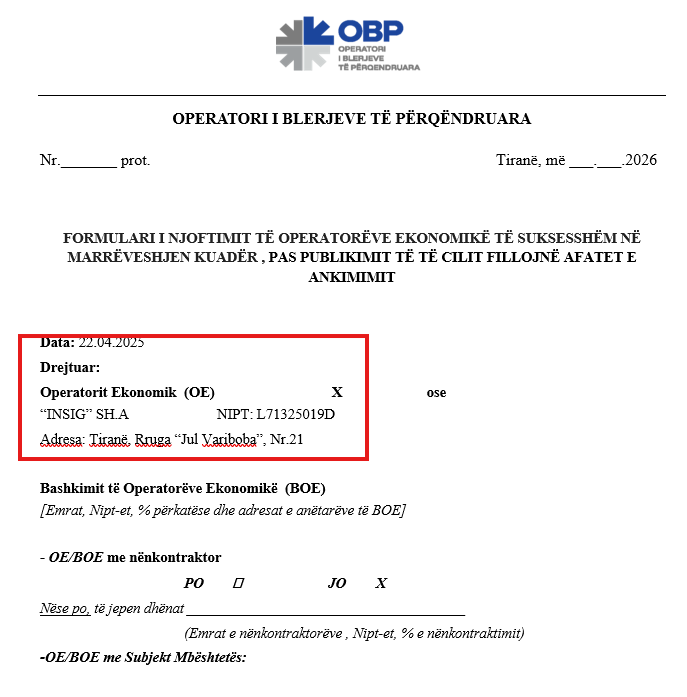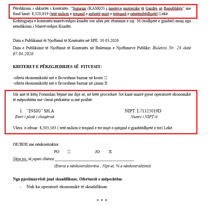 Një tjetër procedurë prokurimi nën ombrellën e Operatorit të Blerjeve të Përqendruara (OBP), i drejtuar nga Arlinda Pogaj, po ngre dyshime serioze për klientelizëm dhe mungesë të theksuar transparence. Me një manovër që "përzë" konkurrencën, institucioni ka shpallur fituesin e tenderit për sigurimin KASKO të mjeteve të Gardës së Republikës, duke i kaluar rreth 100 mijë euro me TVSH kompanisë "INSIG" në pronësi të Kadri Morinajt.
