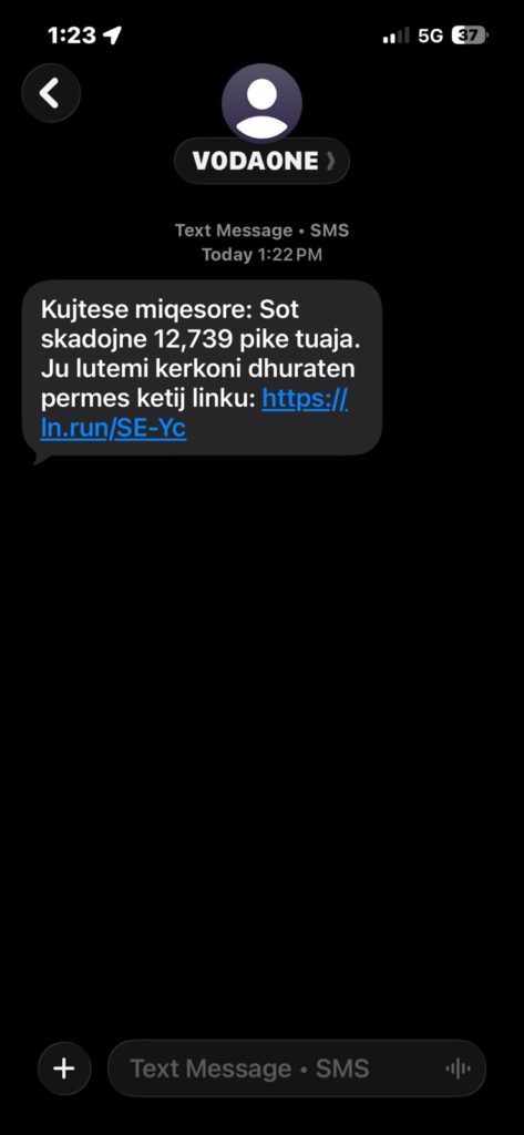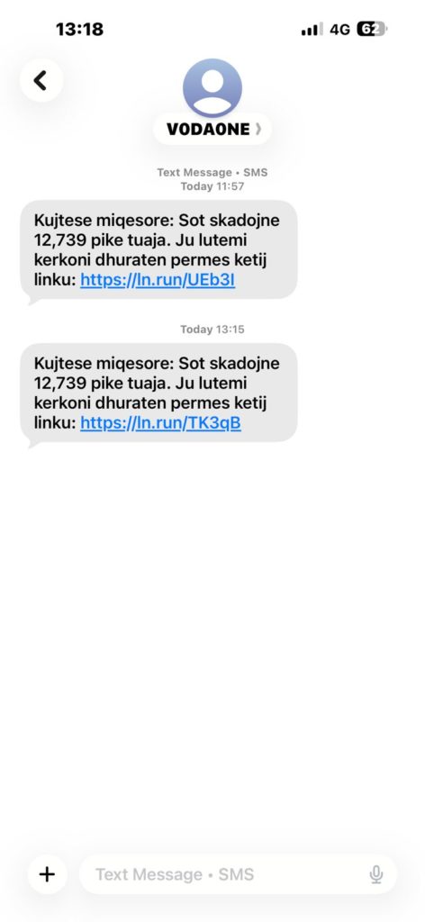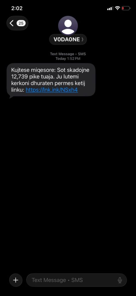 Ndërkohë, në një rast të dytë, një tjetër mesazh i dërguar në emër të “Vodafone” njofton për pikë që skadojnë dhe u kërkon përdoruesve të klikojnë në një link për të përfituar dhurata si pajisje elektronike. Sipas denoncimit, pasi qytetarët ndjekin hapat, u kërkohen të dhëna të ndjeshme si numri i kartës bankare, çka përforcon dyshimet për një skemë mashtrimi online.