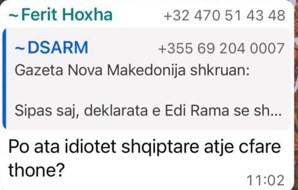 Ministri për Punët e Jashtme, Ferit Hoxha, është përfshirë në një skandal pas publikimit të një mesazhi në një grup komunikimi në WhatsApp me diplomatë, ku dyshohet se ka përdorur gjuhë fyese ndaj shqiptarëve në Maqedoninë e Veriut. Në mesazh ai shprehet: “Po ata idiotët shqiptarë atje, çfarë thonë?”, duke reaguar ndaj një lajmi të shpërndarë në grup që flet për Edi Ramën.