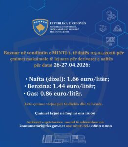 Sipas njoftimit, benzina kushton deri në 1.44 euro për një litër, ndërsa gazi 0.86 euro.