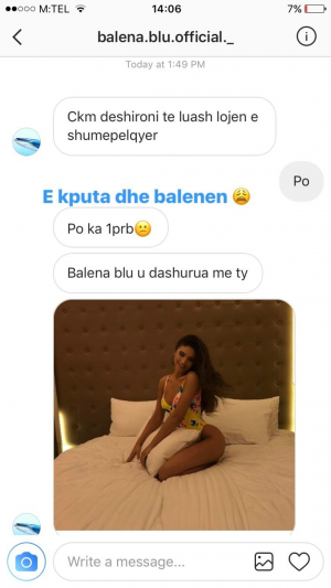 Kështu, e fundit që është "sulmuar" nga balena ka qenë modelja seksi Oriola Marashi. Aio ka publikuar disa foto të bisedave në rrjetet sociale, ku balena i ka propozuar të luajnë lojën.