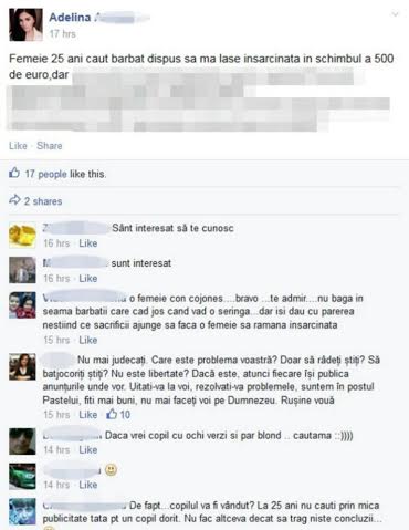 Vajza është nga Rumania dhe kërkon që ofruesi potencial të bëjë testin për të parë nëse ai ka sëmundje gjenetike, si dhe të pranojë që nuk do të kërkoj të drejtat e atësisë mbi fëmijën.