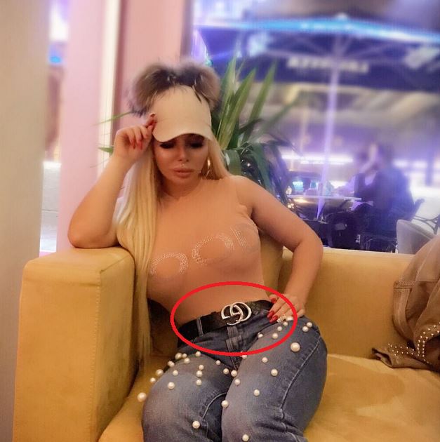 Ajo duket e veshur me xhinkse dhe një bluze nude, por rripin e markës Gucci e ka vënë në anë të kundërt.