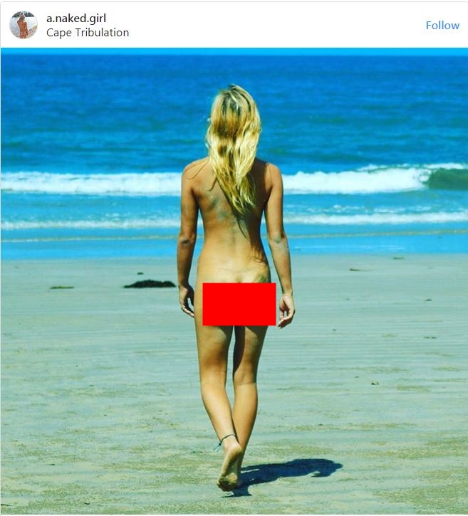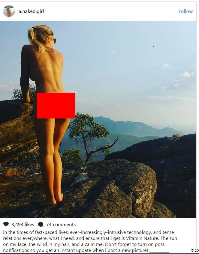 Llogaria e saj në Instagram quhet “a naked girl” dhe është plot me imazhe të saj krejtësisht lakuriq me sfond fushash, lumenj dhe plazhesh.